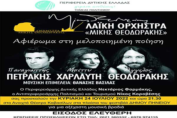 10o Φεστιβάλ Δήμου Πηνειού: Αφιέρωμα στην μελοποιημένη ποίηση από την Λαϊκη Ορχήστρα “Μίκης Θεοδωράκης”
