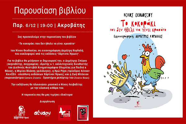 Σας προσκαλούμε στην παρουσίαση του παιδικού παραμυθιού "Το κοκοράκι που δεν ήθελε να γίνει κρασάτο" του Νίκου Θεοδοσίου, σε εικονογράφηση Δημήτρη Κορδαλή, που κυκλοφορεί από τις εκδόσεις "Χάρτινοι Ήρωες".