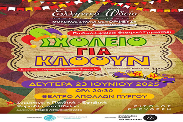 Το Θεατρικό Εργαστήρι του Ελληνικού Ωδείου Παραρτήματος Πύργου, παρουσιάζει τη Δευτέρα 23 Ιουνίου 2025 και ώρα 8 μ.μ. στο θέατρο «ΑΠΟΛΛΩΝ» την παράσταση «Σχολείο για κλόουν» του Friedrich Karl Waechter, σε ανοιχτή πρόσκληση και δωρεάν είσοδο για το κοινό!