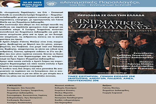 Οι «Αινιγματικές Παραλλαγές» του Eric Emmanuel Schmitt, σε σκηνοθεσία των Σωτήρη Τσαφούλια και Πυγμαλίωνα Δαδακαρίδη, μετά την τεράστια επιτυχία με τις sold out παραστάσεις που σημείωσε στην Αθήνα, έρχεται στο 35ο Φεστιβάλ Αρχαίας Ήλιδας.