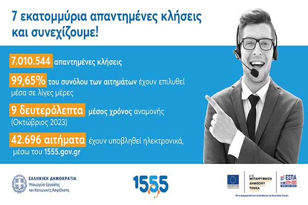 Υπ.Εργασίας: Ξεπέρασαν τα 7 εκατομμύρια οι απαντημένες κλήσεις πολιτών στο 1555
