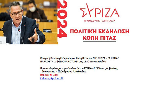 ΣΥΡΙΖΑ Ηλείας: Την Παρασκευή 2/2 η κεντρική πολιτική εκδήλωση και η κοπή της πίτας