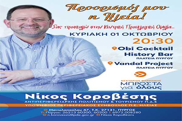 Νίκος Κοροβέσης: Την Κυριακή 1/10 η Κεντρική Προεκλογική Ομιλία στον Πύργο