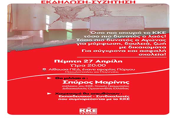 ΚΚΕ Ηλείας: Εκδήλωση-συζήτηση για τις κρίσεις διευθυντών στις σχολικές μονάδες