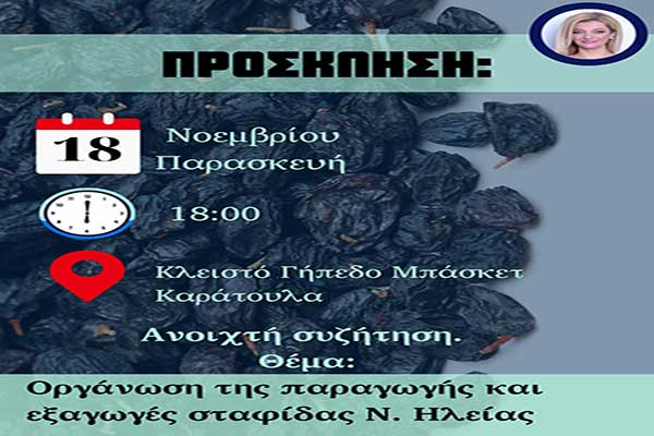 - Αυγερινοπούλου: Δεύτερη ανοιχτή συζήτηση για την οργάνωση της παραγωγής και της εξαγωγής σταφίδας του Ν. Ηλείας στο Καράτουλα