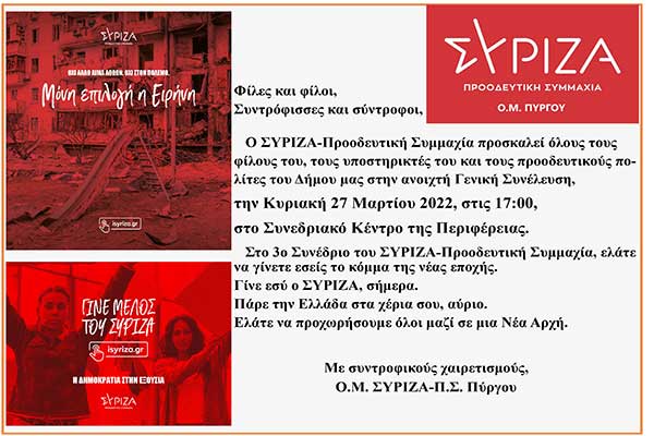 Ο.Μ. ΣΥΡΙΖΑ-Π.Σ. Πύργου: Aνοιχτή Γενική Συνέλευση την Κυριακή 27 Μαρτίου