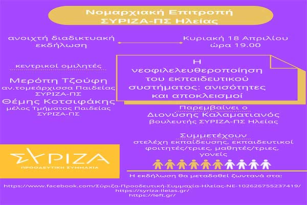 ΣΥΡΙΖΑ-ΠΣ Ηλείας: Ανοιχτή διαδικτυακή εκδήλωση "Η νεοφιλελευθεροποίηση του εκπαιδευτικού συστήματος: ανισότητες και αποκλεισμοί"